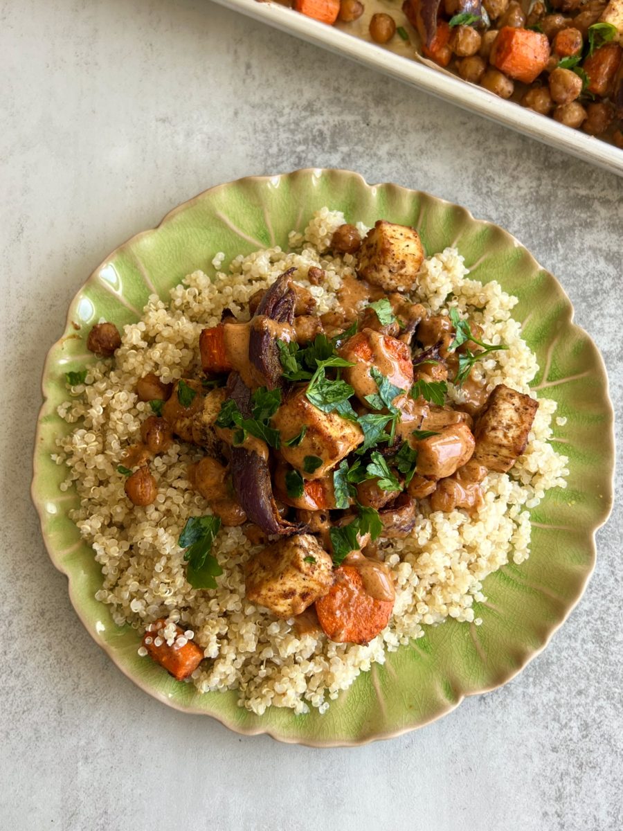 This simple sheet-pan tofu & veggies is so delicious on its own with the spice combination. But I love adding an extra layer of flavor by serving it with my creamy harissa almond butter sauce.