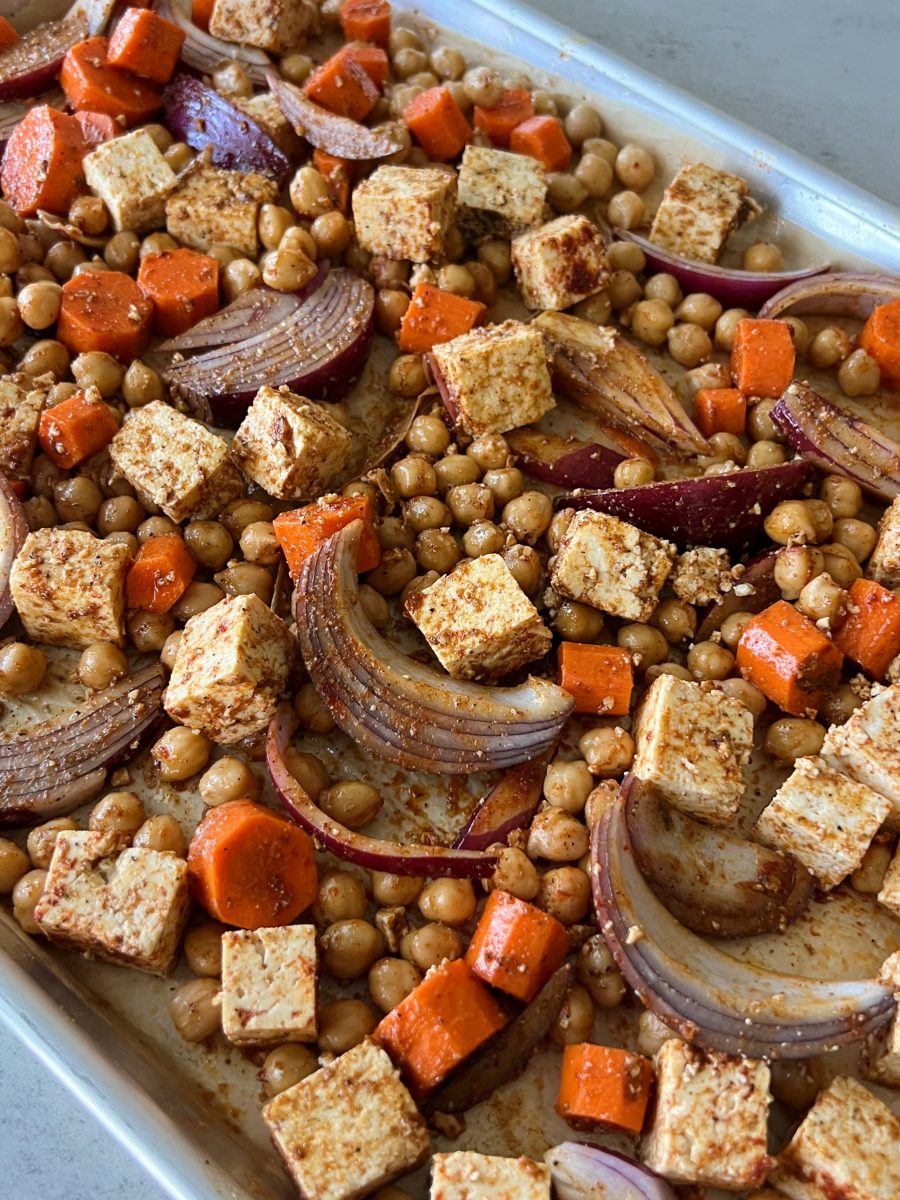 I love to keep things simple for dinners, especially ones that double as meal prep for lunches during the week. This flavorful one-pan meal is made with roasted tofu, carrots, red onion and chickpeas, and is filled with plant-based protein and fiber.