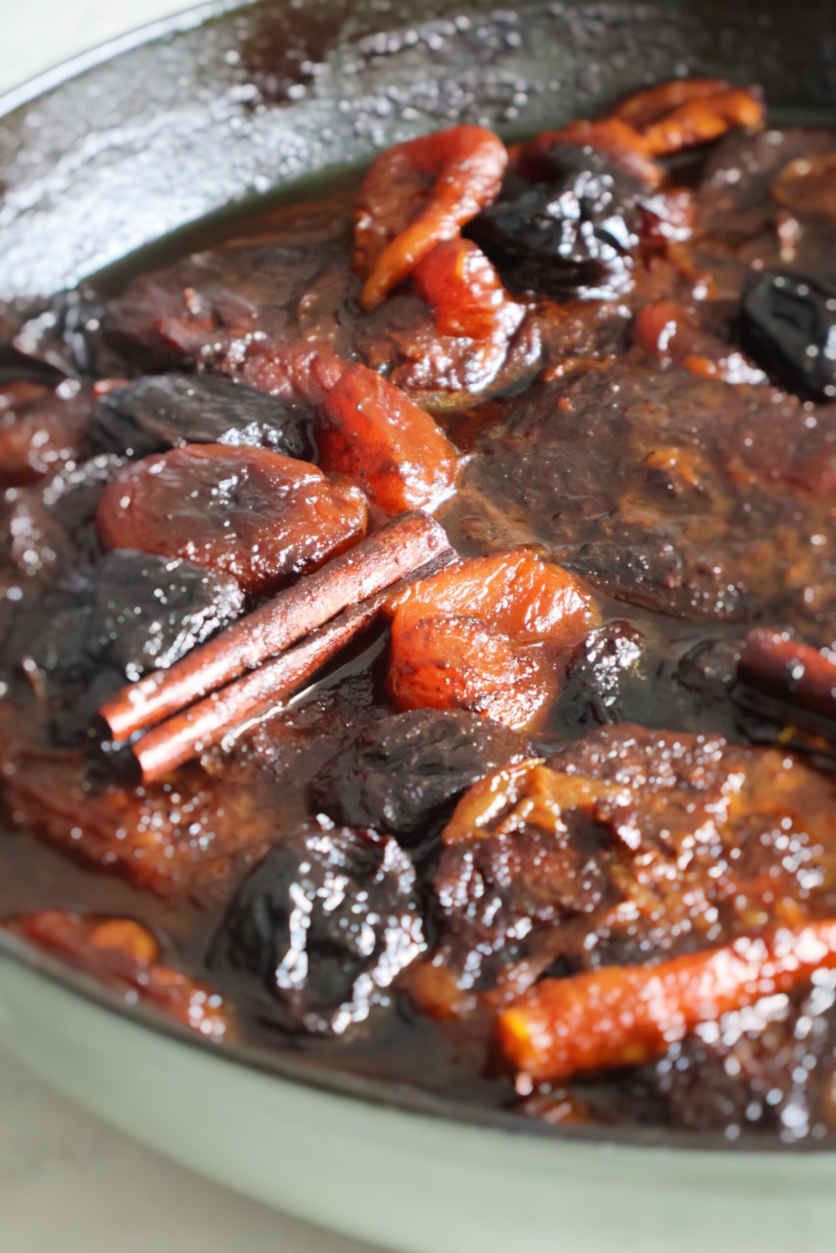 With Rosh Hashana just a week away, I wanted to share one of my favorite meat dishes to make for the holiday. Seared minute steaks cooked low and slow in a sweet cinnamon sauce with dried apricots, dried prunes and date syrup.