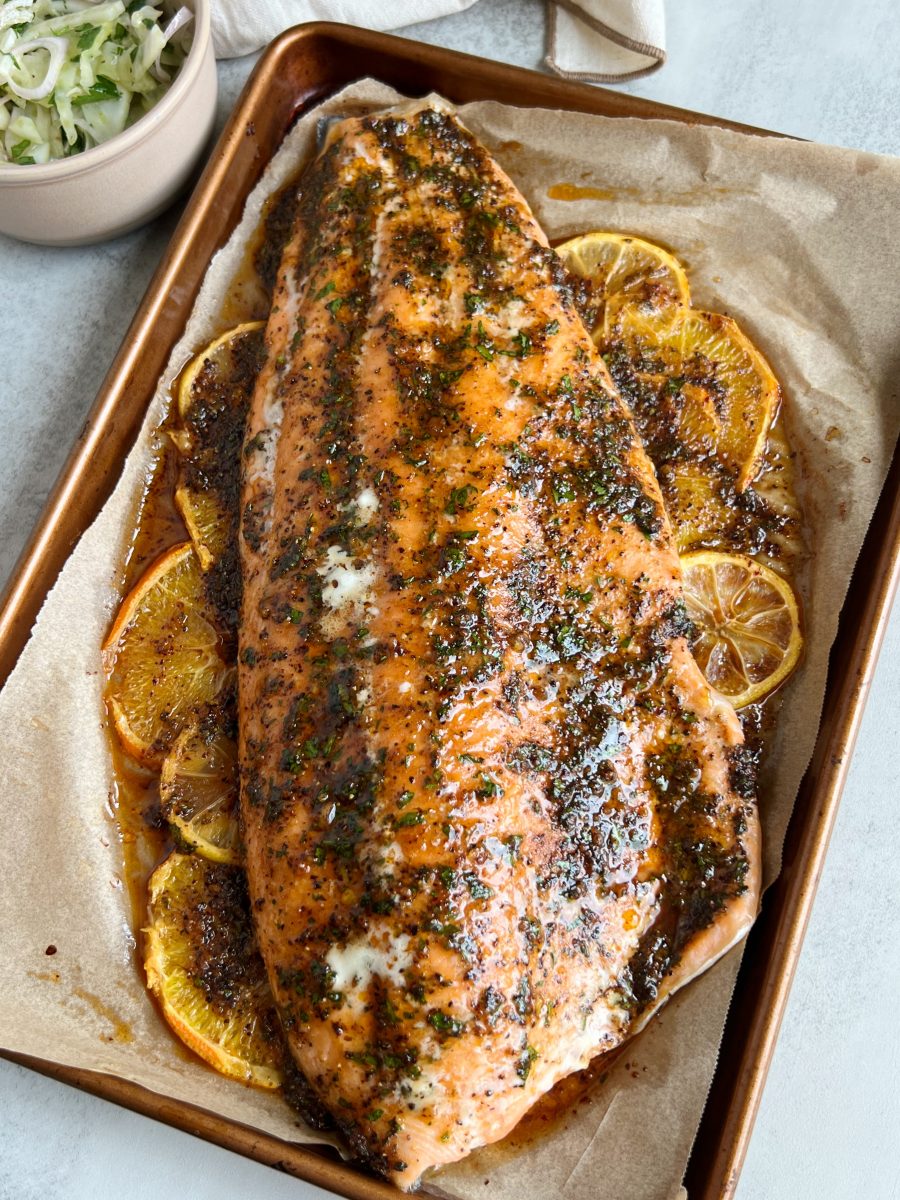 - Layer thinly sliced lemon and orange slices on a parchment lined sheet-pan, then place the salmon fillet over the citrus.