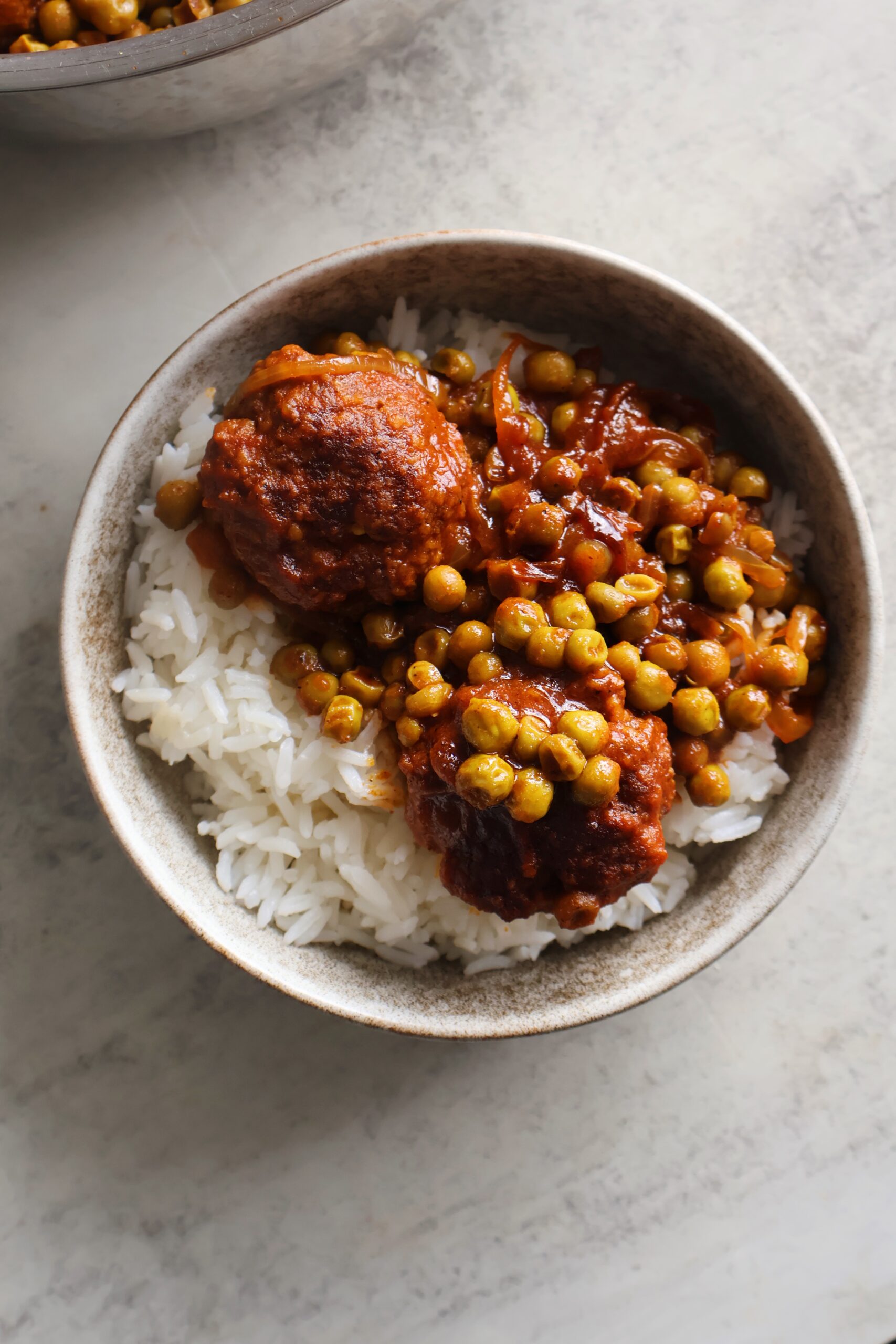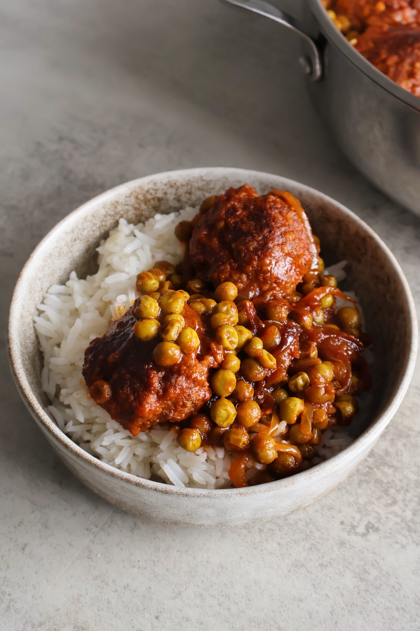 This dish is a childhood favorite of mine and one I always go back to when I’m craving a home cooked meal. It’s a flavor-packed recipe made of spiced meatballs that are seared then cooked in a tomato- based sauce with peas and tons of warm spices.