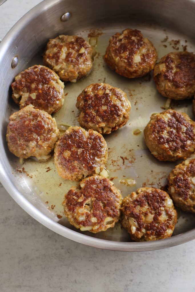 - You’ll start by prepping the meatballs and searing them in olive oil for 3 minutes per side. I like to roll them into balls, then gently flatten them so they sear evenly.