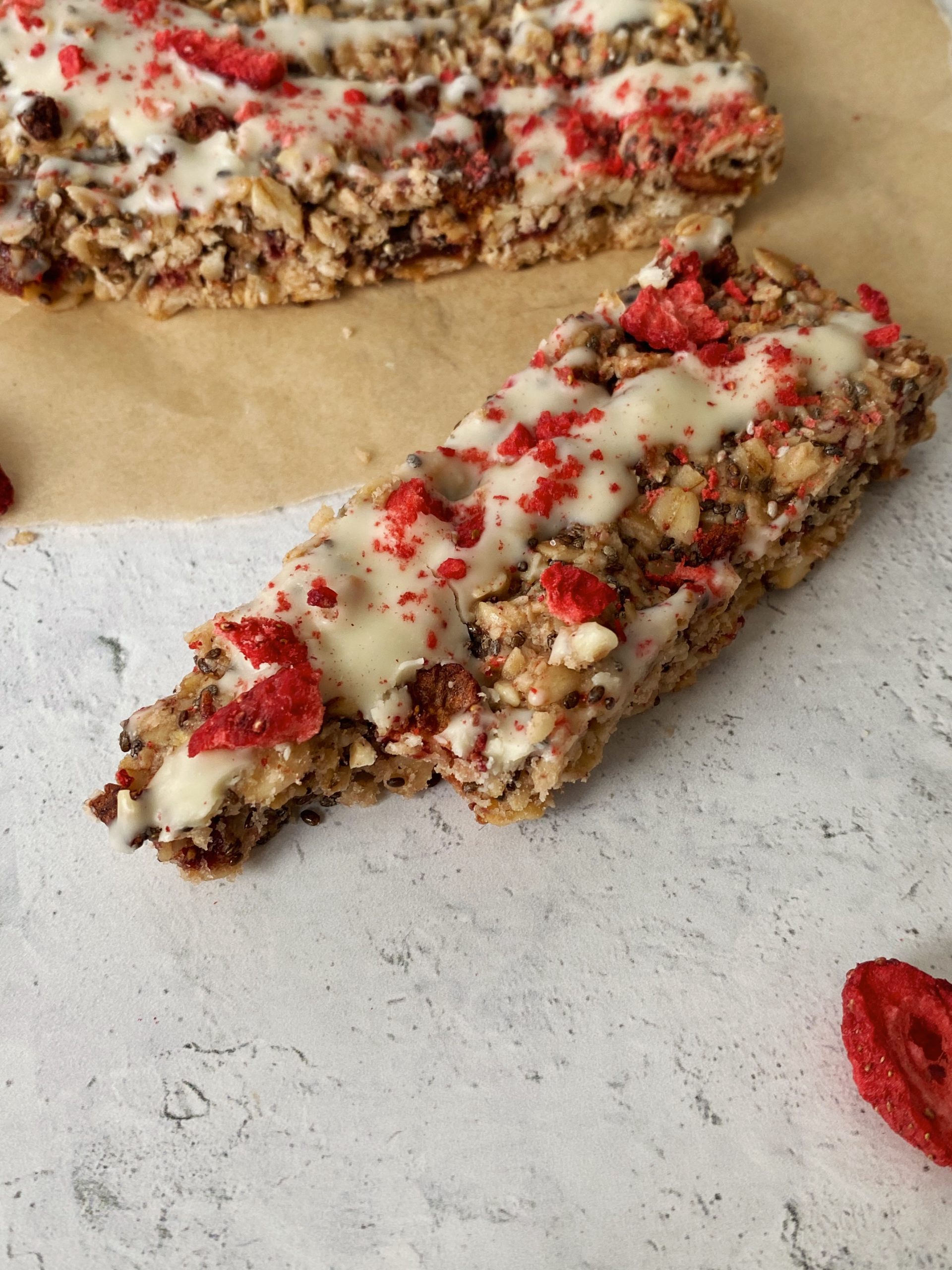 They’re perfect as a grab-n-go breakfast when you’re in a pinch for time, or delicious as a midday snack. These bars are loaded with feel good ingredients like rolled oats, cashews, chia seeds and freeze-dried strawberries.