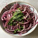 Sumac marinated onions, also known as Turkish onion salad, are a delicious topper for salads, proteins or rice bowls. Thinly sliced red onion is tossed with olive oil, lemon juice, parsley, sumac and salt, then marinated for an hour to help the flavors come together.