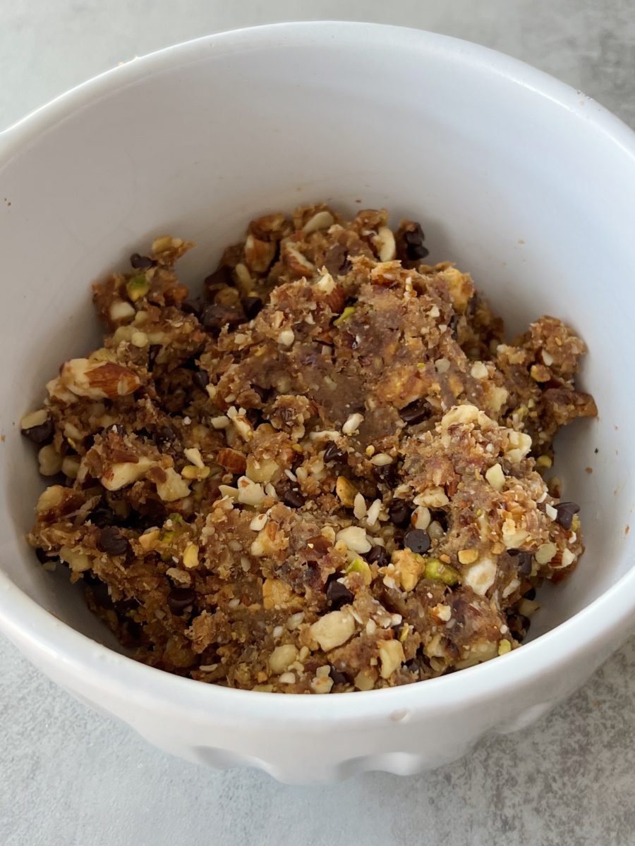 - Add the date mixture into the nut bowl with the chocolate chips. Work the mixture in with your hands to combine everything together. I like to do this with wet hands, making sure everything gets fully incorporated