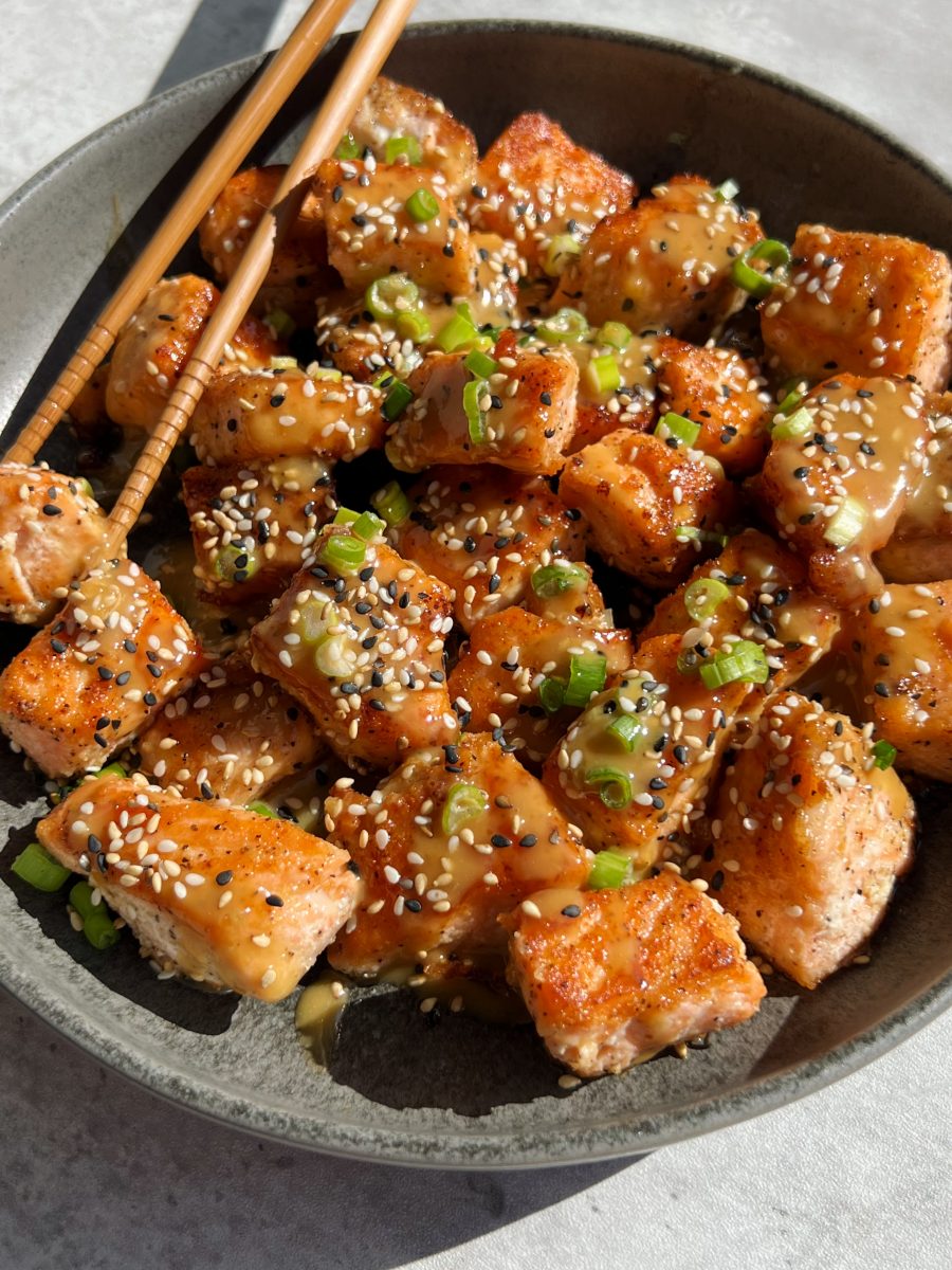Salmon bites are always a go-to dinner of mine because they get the perfect crisp all around. I love them over a rice bowl with a side salad or roasted veggies, and love switching up what sauce to pair them with.
