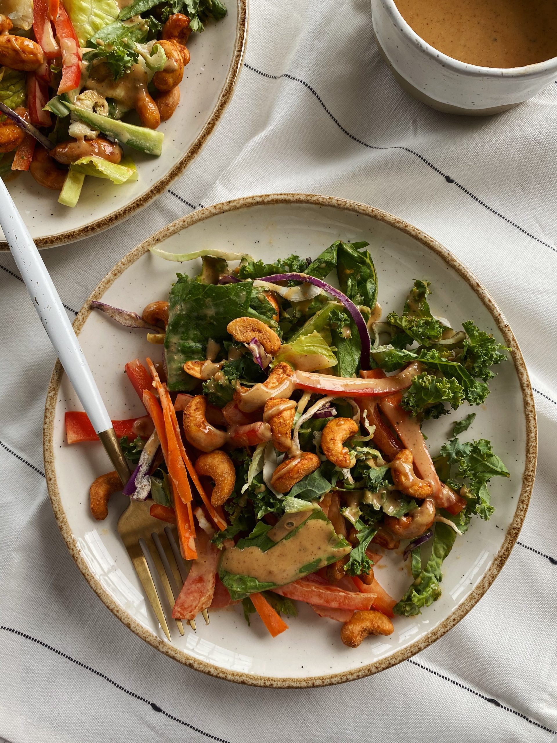 This Thai salad with peanut sauce checks all of those boxes. You’ve got veggies of all colors (green, orange, red, purple), roasted cashews for an added crunch, natural sweetness from the bell peppers & peanut butter, and most importantly, a kick ass dressing.