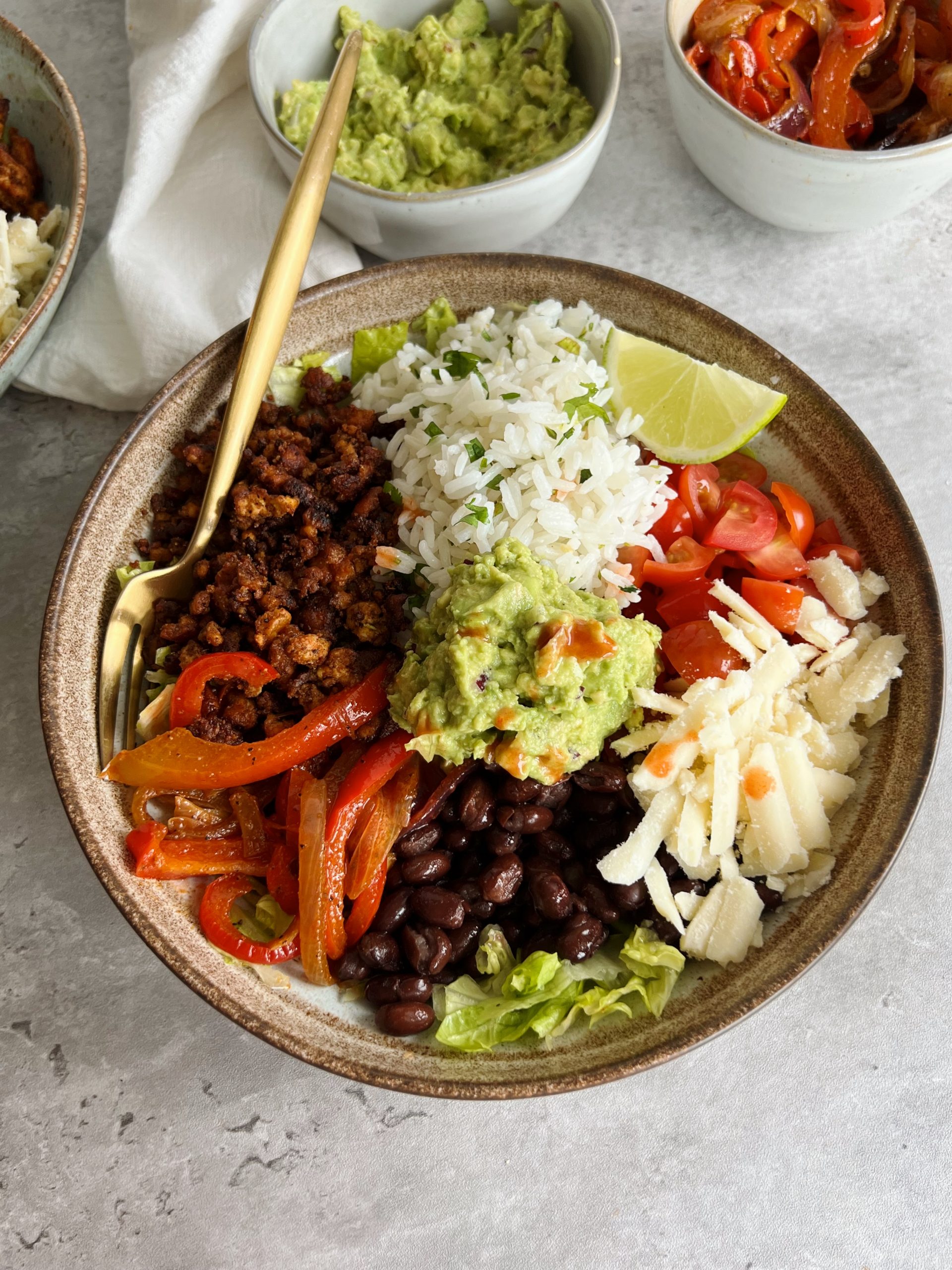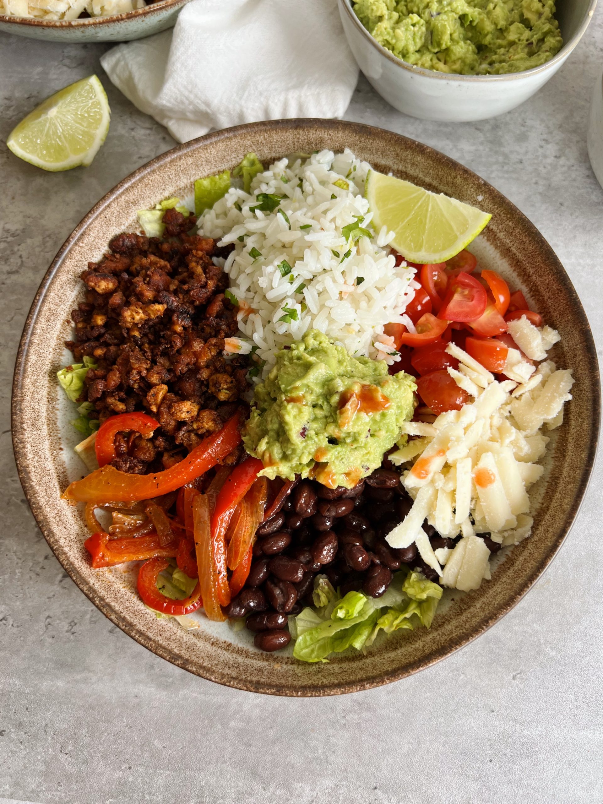 These bowls have ALL of the goods, like cilantro lime rice, crispy tofu crumbles, fajita veggies, and homemade guacamole. You can even make them vegan by swapping your favorite vegan shredded cheese!
