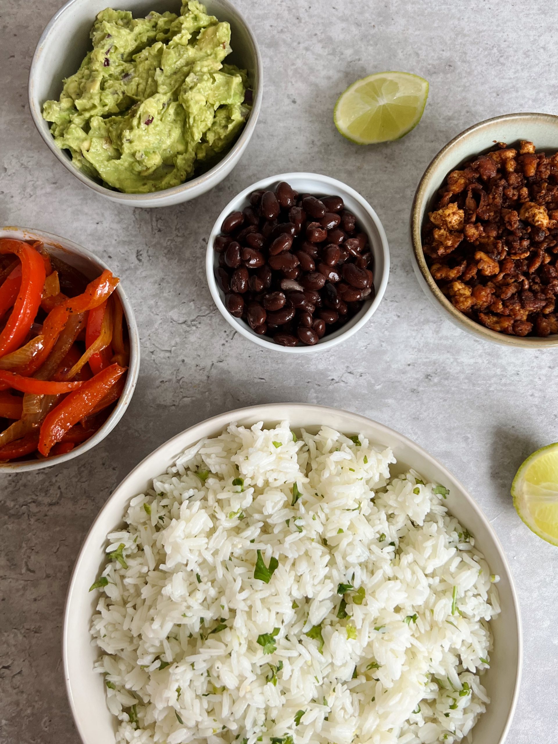 Save your money on takeout and make these delicious tofu burrito bowls filled with cilantro lime rice, crispy tofu crumbles, fajita veggies, and a homemade guacamole!