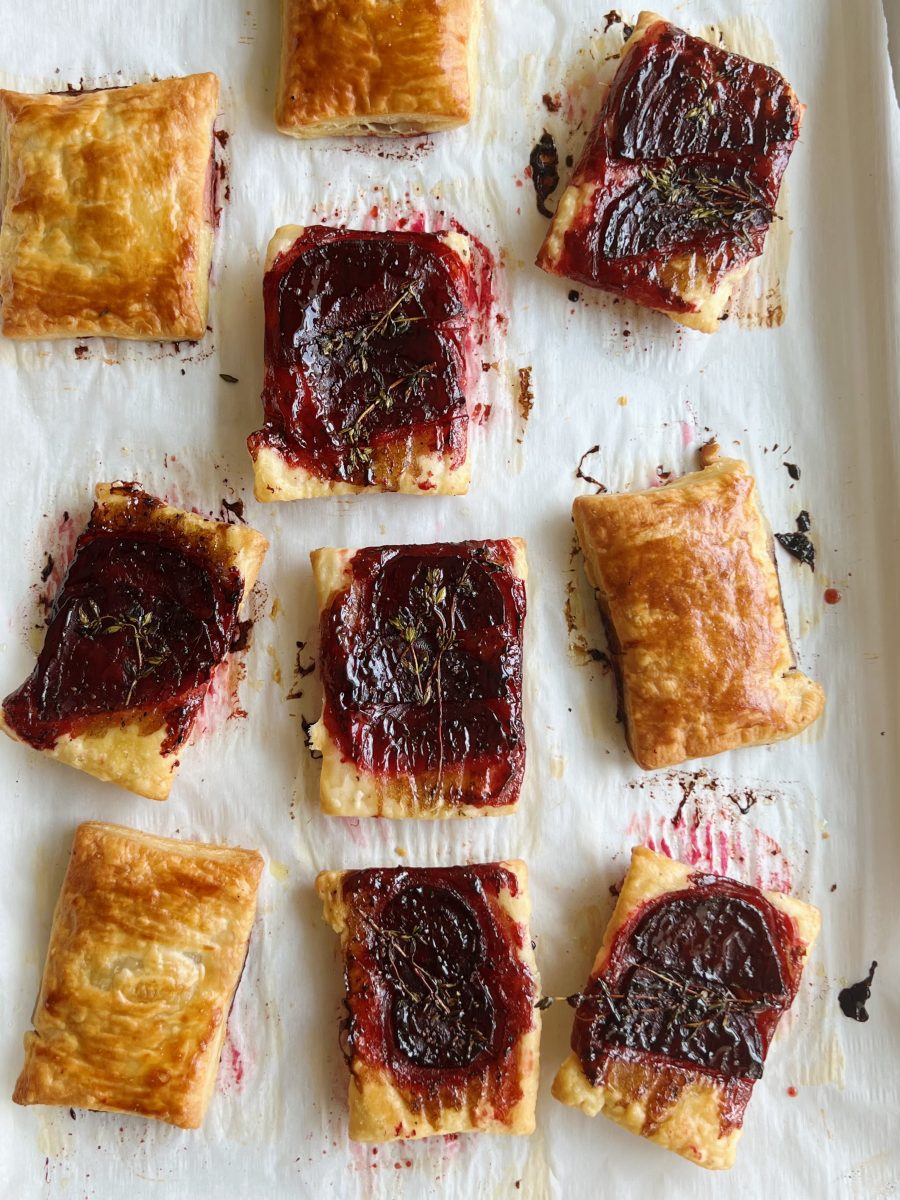 - Repeat with remaining beets and pastry, making sure to separate them enough on the pan so that they don’t touch. Once the pastries are all assembled, brush the tops with whisked egg.