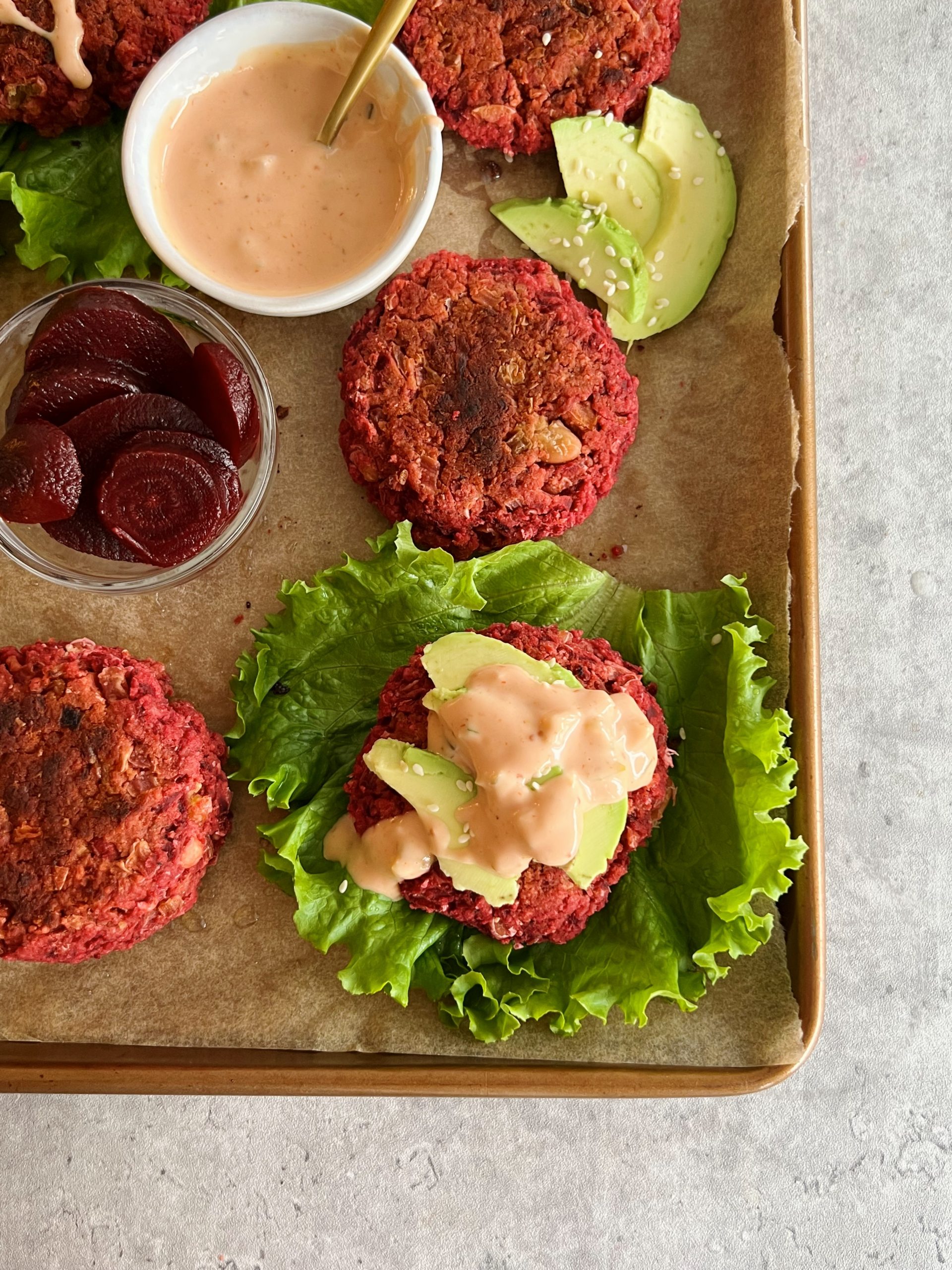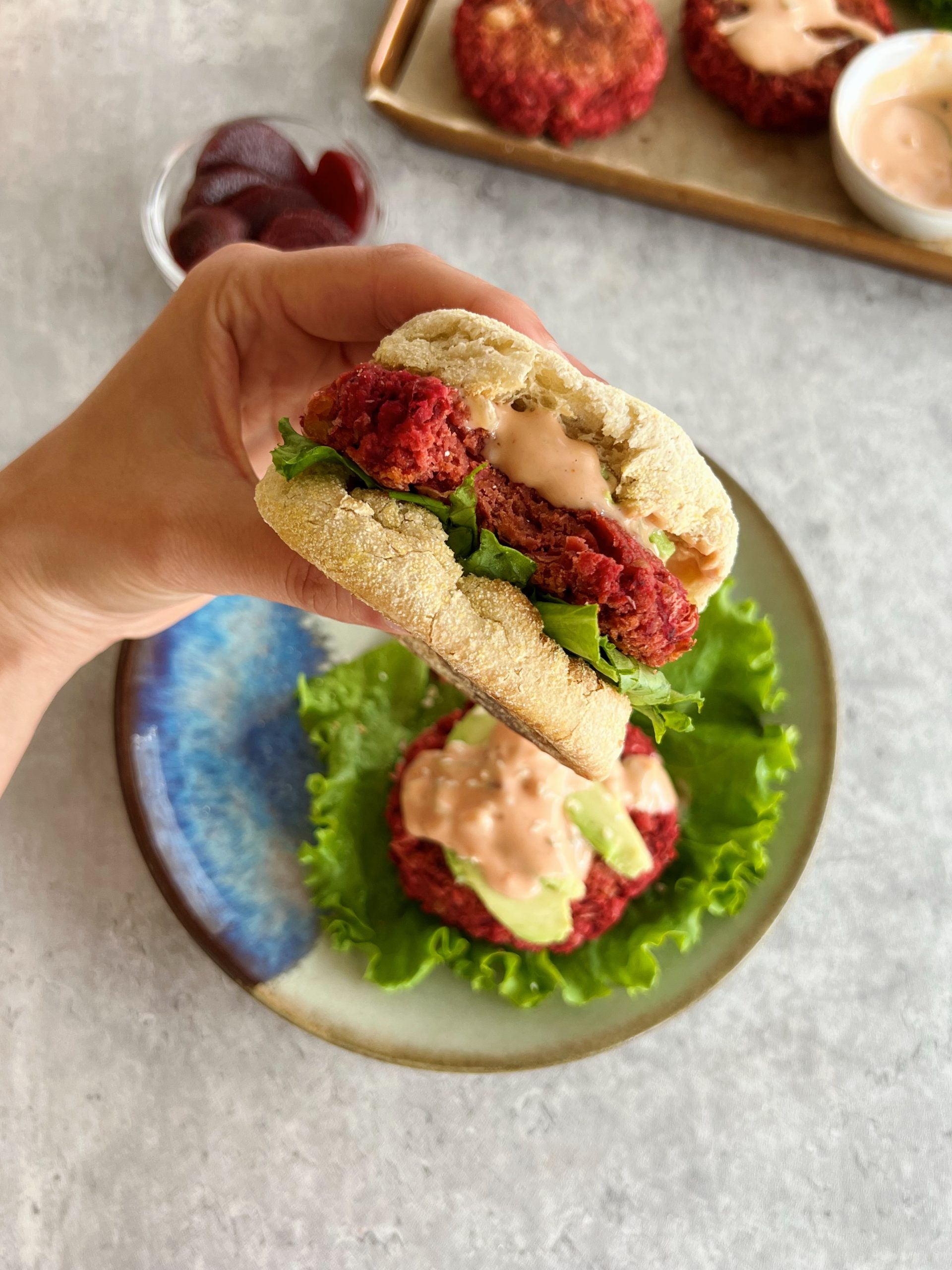 These vibrant and delicious beet burgers are packed with plant-based protein and fiber, and are the perfect veggie burger to meal prep. I love serving them on a toasted english muffin or wrapped in lettuce with a homemade burger sauce. It adds the perfect tang to these burgers, and adds the best flavor.