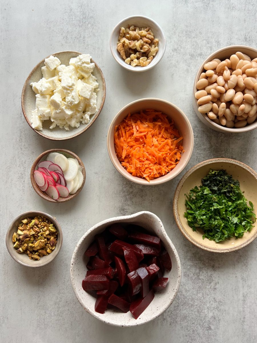 - Slice the cooked beets into strips and the rainbow radish into thin rounds. Add them to a salad bowl with the drained beans, grated carrots, chopped herbs, nuts and feta cheese.