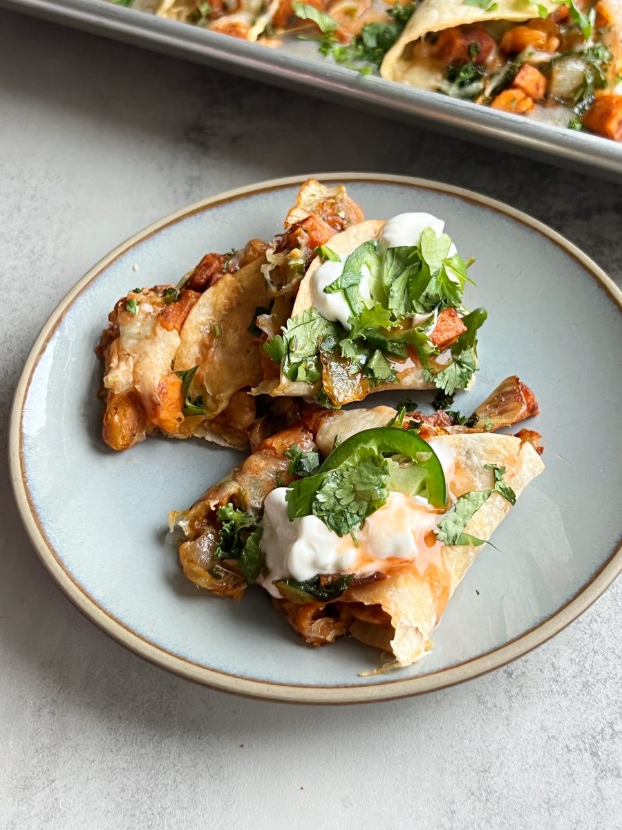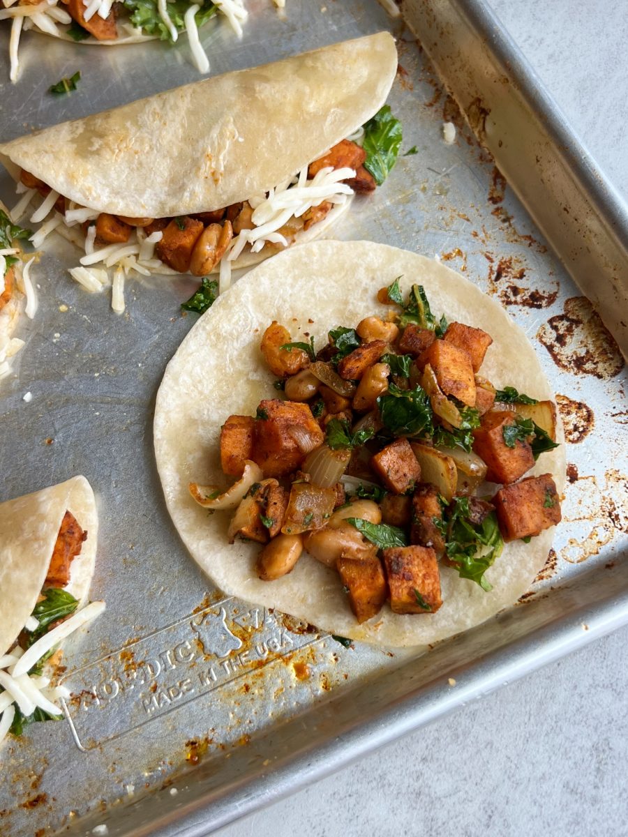 Baked white bean and sweet potato tacos are an easy and nourishing weeknight meal. They’re loaded with fiber, plant-based protein and so much flavor, and are a delicious way to eat more veggies. The sweet potato, beans and onion are roasted in a homemade spice blend and olive oil, then stuffed into tortillas with shredded cheese and baked until crispy.
