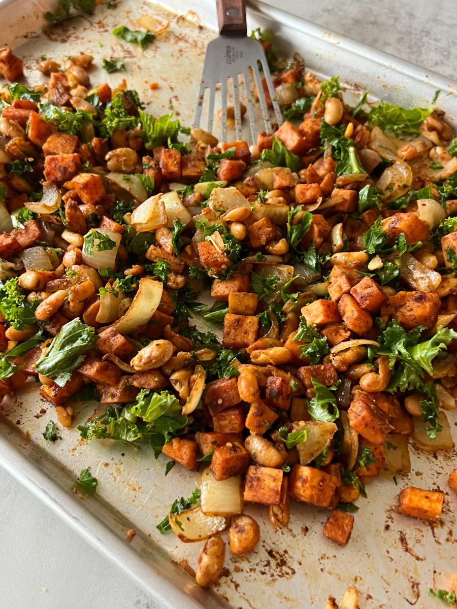 - Dice the sweet potato and chop the onion and add it to a large sheet pan with the drained white beans. Toss the veggies with about 2 tbsp of olive oil and all of the spices.