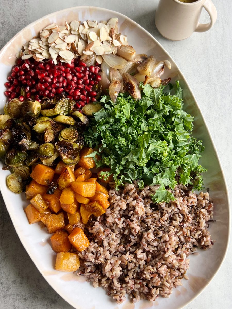 This nourishing wild rice harvest salad is the perfect holiday dish. It’s full of hearty ingredients like a wild rice blend, roasted butternut squash, roasted brussels sprouts and sliced almonds. Everything gets tossed together in a simple maple dijon vinaigrette for a sweet & tangy dish.