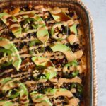 Once done, garnish with sesame seeds, more sauces, avocado, scallions and jalapeños